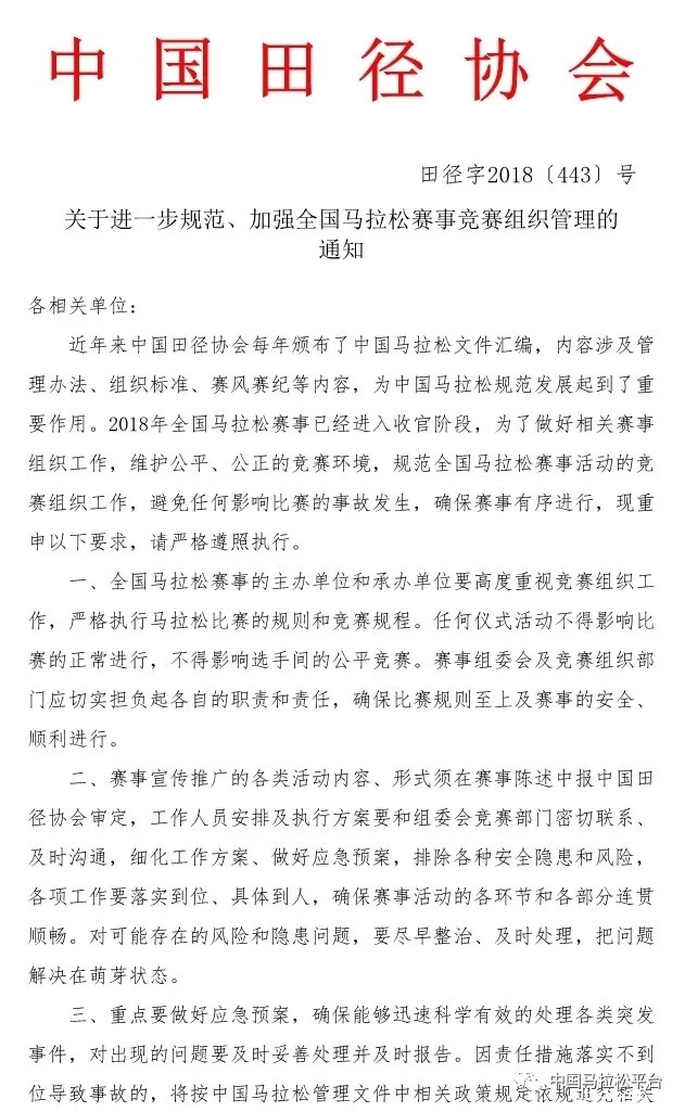 近期,针对马拉松赛事出现的一些问题,中国田径协会出台相关文件通知对如何做好赛事组织工作,维护公平、公正的竞赛环境,规范马拉松赛事活动作出了相关规定,现将中国田径协会《关于进一步规范、加强全国马拉松赛事竞赛组织管理的通知》(田径字【2018】443号)转发你们,请认真遵照执行。同时,请严格按照《关于规范与区县政府共同主办马拉松赛办赛流程的通知》(渝体【2018】223号)相关要求,做好马拉松赛事竞赛组织工作,确保安全、规范开展。
